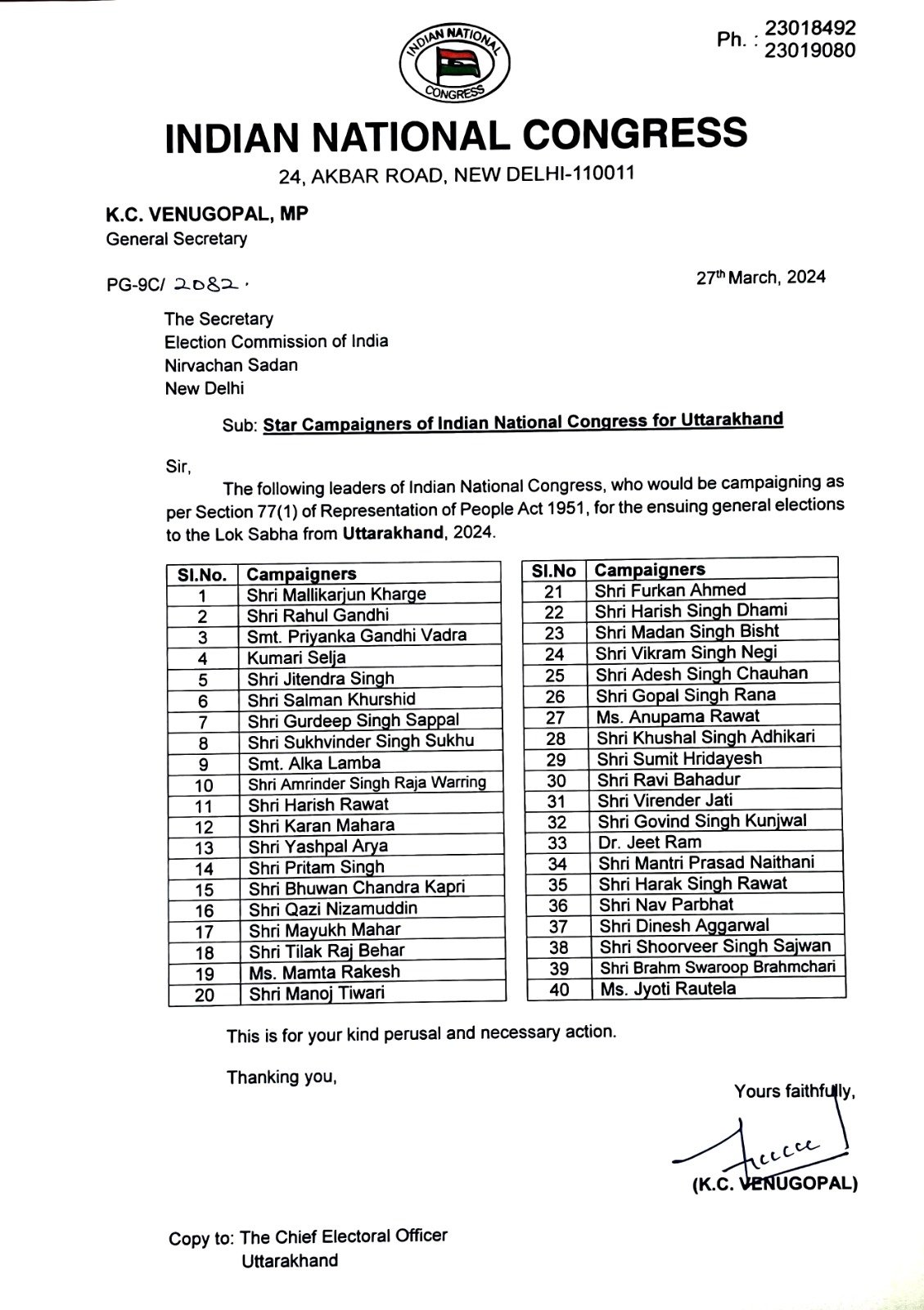 देहरादून कांग्रेस की स्टार प्रचारकों की लिस्ट जारी 40 स्टार प्रचारक करेंगे उत्तराखंड में प्रचार – प्रसार कांग्रेस के राष्ट्रीय अध्यक्ष मल्लिकार्जुन खड़गे, पूर्व राष्ट्रीय अध्यक्ष राहुल गांधी, प्रियंका गांधी वाड्रा, प्रदेश प्रभारी कुमारी शैलजा समेत कई नेता मौजूद प्रदेश स्तरीय नेताओ , कांग्रेस विधायक , पूर्व सीएम समेत कई नेता मौजूद