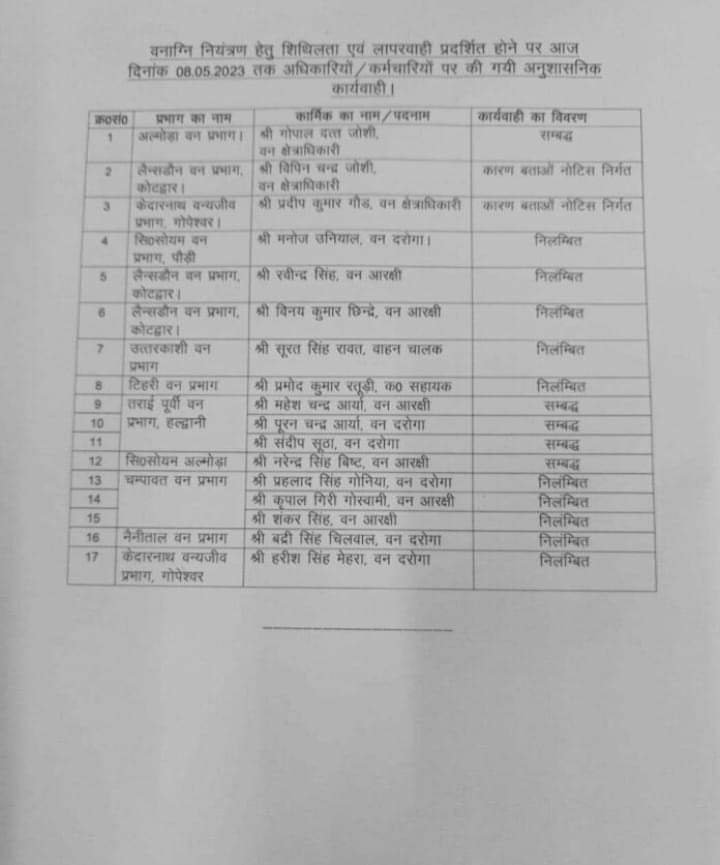 देहरादून वन विभाग के 17 कर्मचारियों पर गिरी गाज, सीएम की सख्ती के बाद विभाग ने 10 को सस्पेंड किया , 5 को अटैच, 2 को कारण बताओ नोटिस हुए जारी, 3 रेंजर, 6 वन दरोगा, 7 वन आरक्षी, 1 कनिष्क सहायक, 1 वाहन चालक पर गिरी गाज,