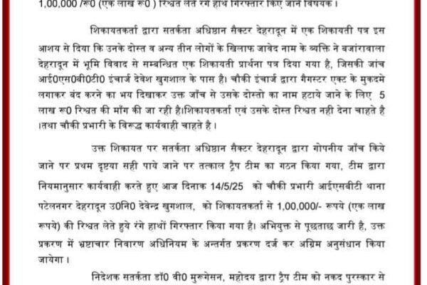 *एक लाख की रिश्वत के साथ आईएसबीटी चौकी प्रभारी गिरफ्तार *भ्रष्टाचार के खिलाफ सीएम धामी की जीरो टॉलरेंस नीति के तहत एक और बड़ी कार्रवाई* *धामी सरकार का 1064 विजिलेंस टोल फ्री नंबर बना प्रदेशवासियों के लिए वरदान* उत्तराखण्ड में भ्रष्टाचार के खिलाफ मुख्यमंत्री पुष्कर सिंह धामी द्वारा चलाए जा रहे सख्त अभियान के अंतर्गत…