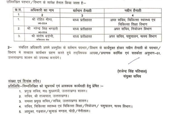 उत्तराखंड शासन से बड़ी खबर, दो आई ए एस ओर एक सचिवालय सेवा संघ के अधिकारी का बदला कार्यक्षेत्र,