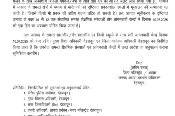 देहरादून मौसम के पूर्वानुमान के अनुसार कल देहरादून जनपद में स्कूल रहेंगे बंद, आकाश से बिजली चमकने और तेज बारिश का ऑरेंज अलर्ट किया गया है जारी, कक्षा एक से कक्षा 12 तक के सभी स्कूल और आंगनबाड़ी केंद्र रहेंगे बंद,