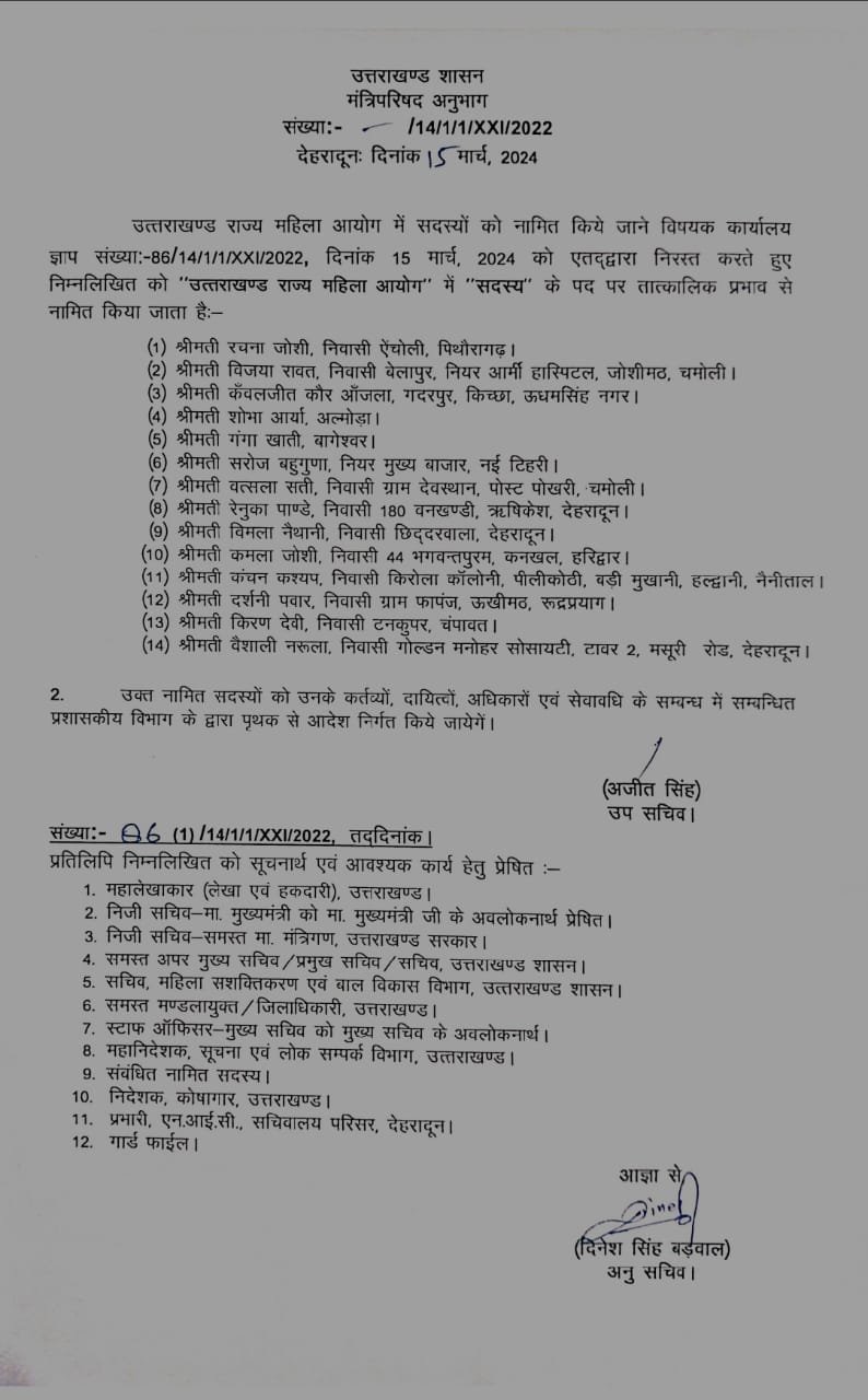 उत्तराखंड महिला आयोग की सदस्य पद पर 14 महिलाए हुए नामित