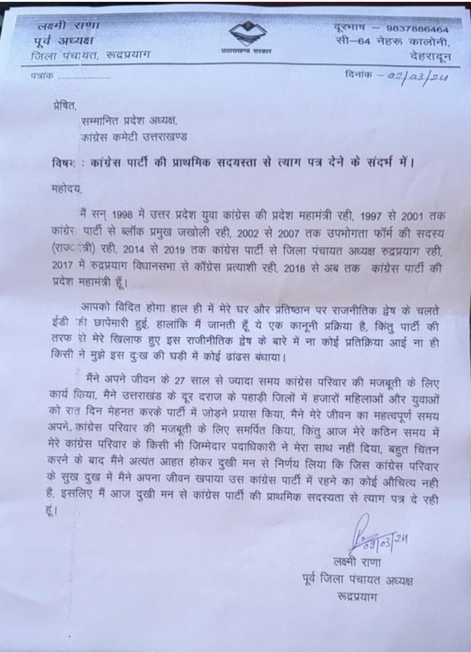 मैंने अपने जीवन के 27 साल से ज्यादा समय कांग्रेस परिवार की मजबूती के लिए कार्य किया, मैने उत्तराखंड के दूर दराज के पहाड़ी जिलों में हजारों महिलाओं और युवाओं को रात दिन मेहनत करके पार्टी में जोड़ने प्रयास किया, मैने मेरे जीवन का महत्वपूर्ण समय अपने, कांग्रेस परिवार की मजबूती के लिए समर्पित किया, किंतु आज मेरे कठिन समय में मेरे कांग्रेस परिवार के किसी भी जिम्मेदार पदाधिकारी ने मेरा साथ नहीं दिया, बहुत चिंतन करने के बाद मैंने अत्यंत आहत होकर दुखी मन से निर्णय लिया कि जिस कांग्रेस परिवार के सुख दुख में मैने अपना जीवन खपाया उस कांग्रेस पार्टी में रहने का कोई औचित्य नही है, इसलिए मैं आज दुखी मन से कांग्रेस पार्टी की प्राथमिक सदस्यता से त्याग पत्र दे रही हूँ।