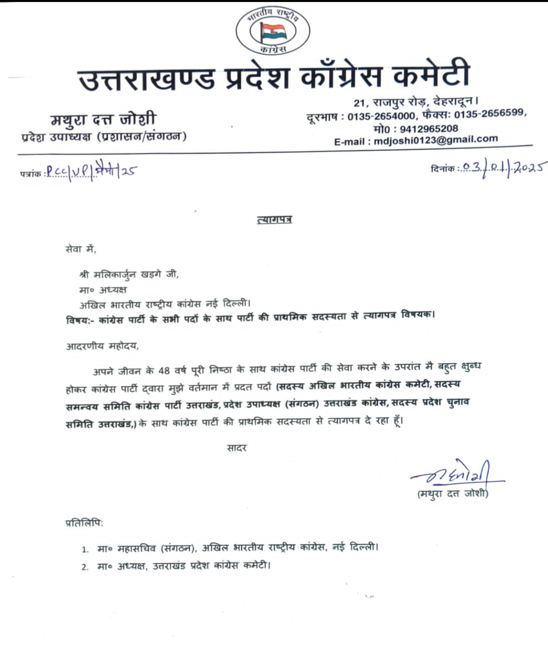 उत्तराखंड कांग्रेस को बड़ा झटका वरिष्ठ नेता मथुरा दत्त जोशी ने दिया इस्तीफा