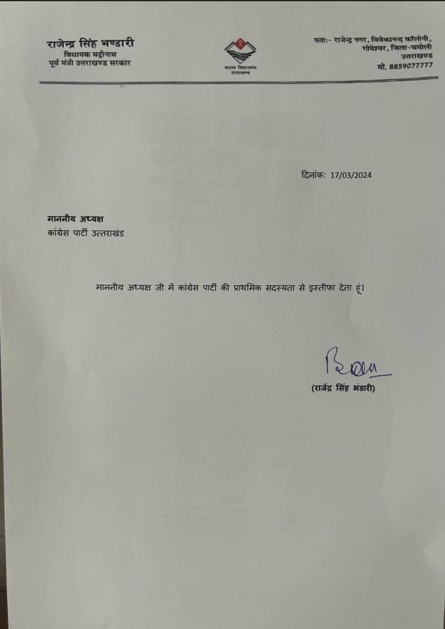 बद्रीनाथ से कांग्रेस पूर्व विधायक रहे राजेंद्र सिंह भंडारी ने आज पार्टी से अपना इस्तीफा देने के साथ ही भाजपा के केंद्रीय मुख्यालय सदस्यता ग्रहण करी..।