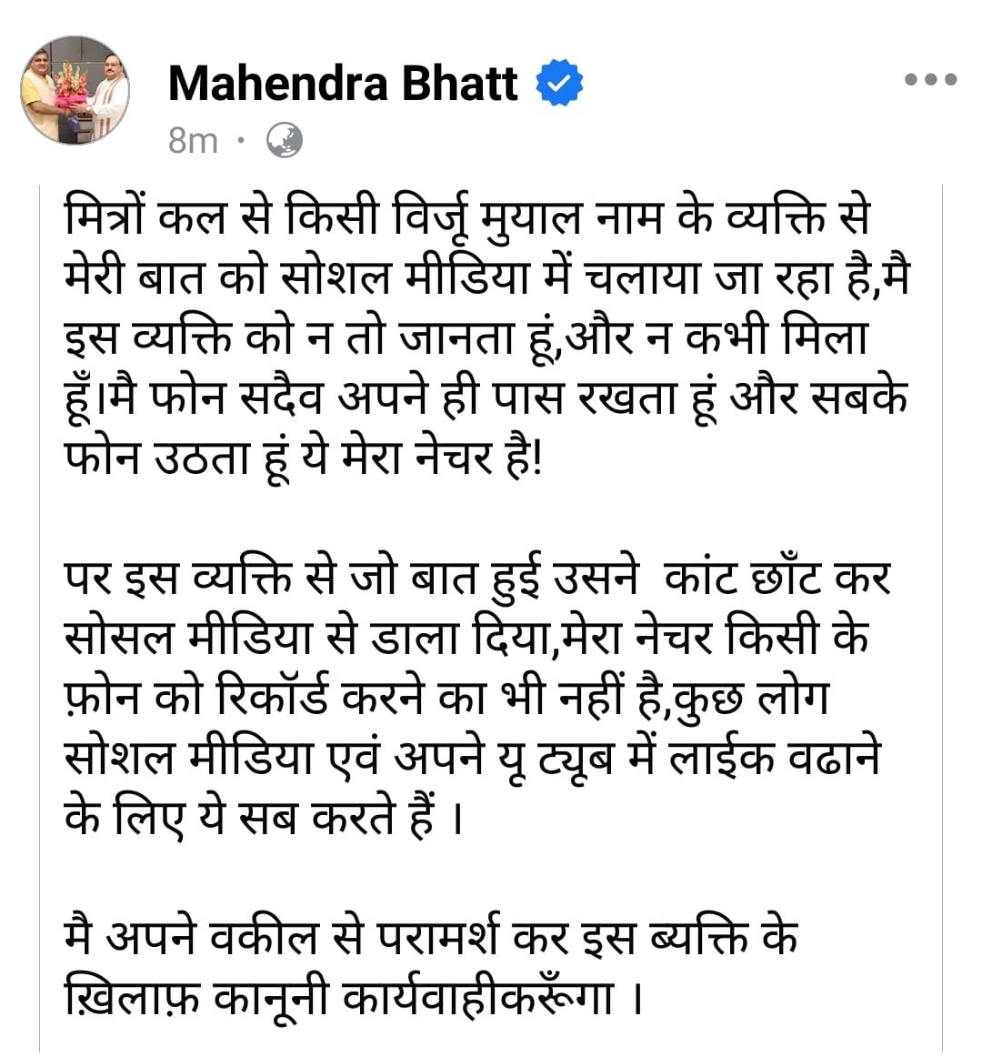भाजपा प्रदेश अध्यक्ष महेंद्र भट्ट ने बिरजू मुयाल के खिलाफ कानूनी कार्रवाई की बात कही,