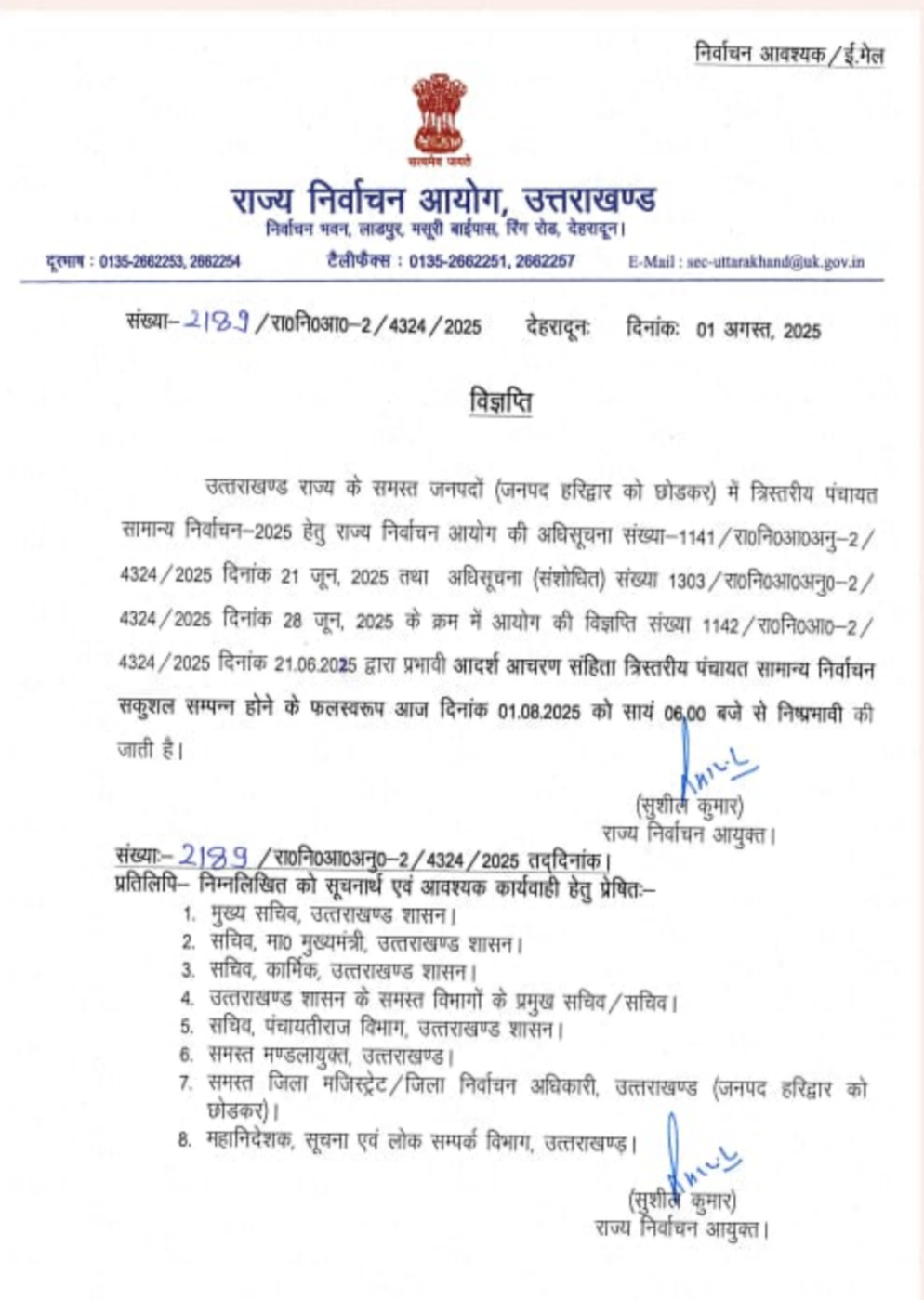 उत्तराखंडउत्तराखंड राज्य के 12 जनपदों में त्रिस्तरीय पंचायत चुनाव के लिए लगी आचार संहिता हुई समाप्त Janmat UK1 August 20251 August 202501 min देहरादून राज्य के 12 जनपदों में त्रिस्तरीय पंचायत चुनाव के लिए लगी आचार संहिता हुई समाप्त, राज्य निर्वाचन आयुक्त सुशील कुमार ने पत्र जारी कर आचार संहिता को किया समाप्त, Post navigation Previous: पंचायत चुनाव में युवाओं ने दिखाया अपना दम कहीं 21 साल तो कहीं 22 साल के युवा बने ग्राम प्रधान चुनावNext: देहरादून में शराब की दुकानों को लेकर जिला प्रशासन का बड़ा एक्शन 6 शराब की दुकानों के लाइसेंस निलंबित Leave a Reply Cancel replyYour email address will not be published. Required fields are marked *Comment * Name * Email * Website Save my name, email, and website in this browser for the next time I comment. Δ