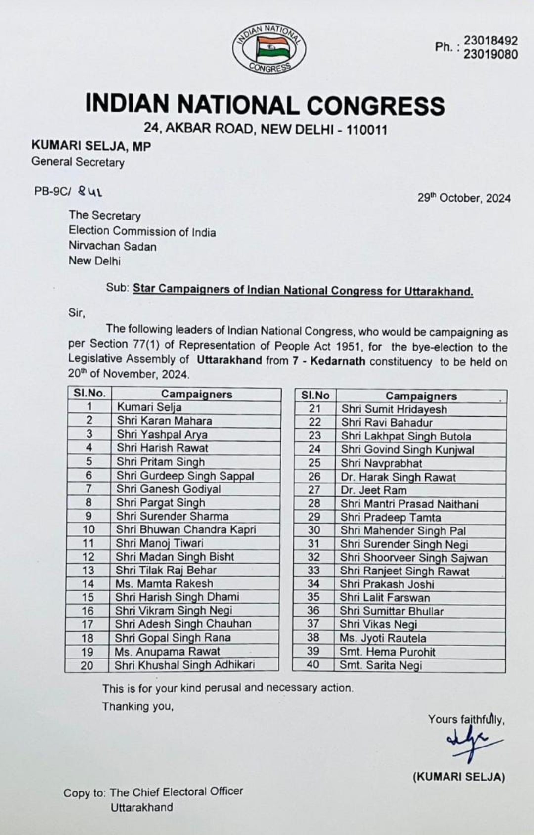 केदारनाथ विधानसभा उप चुनाव को लेकर जारी हुई स्टार प्रचारकों की सूची,