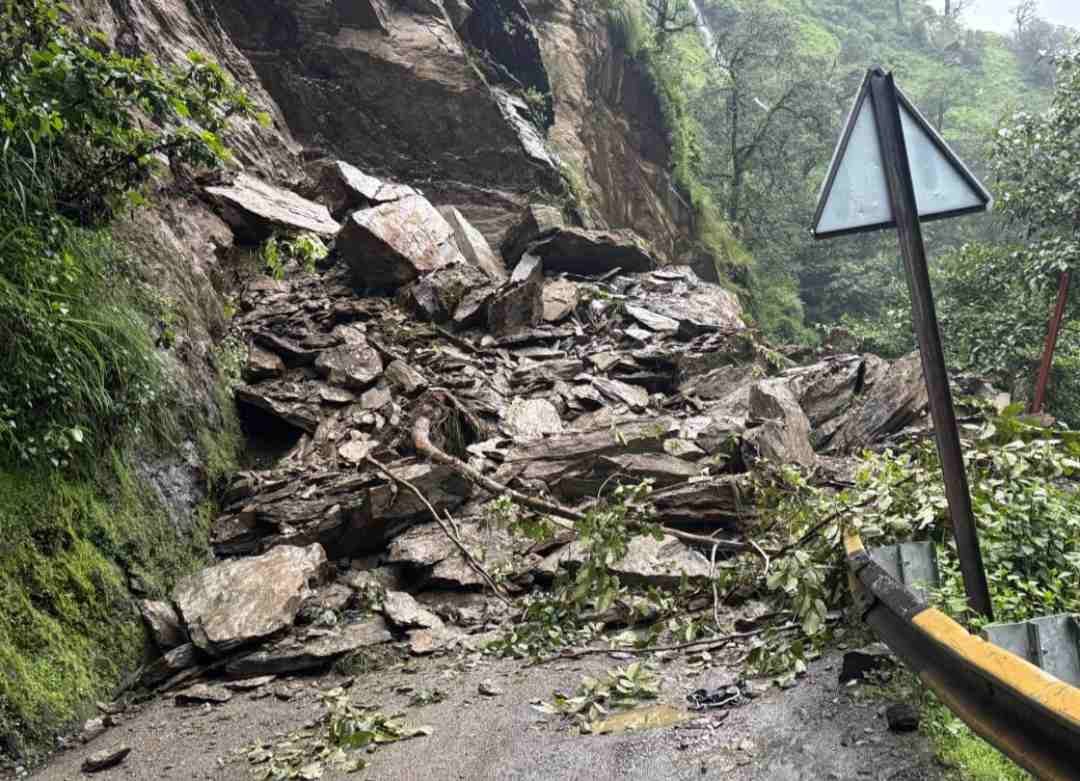 लगातार बारिश के बीच पहाड़ी दरकने से सड़क पर गिरे भारी बोल्डर और मलबा, आवागमन पूरी तरह ठप