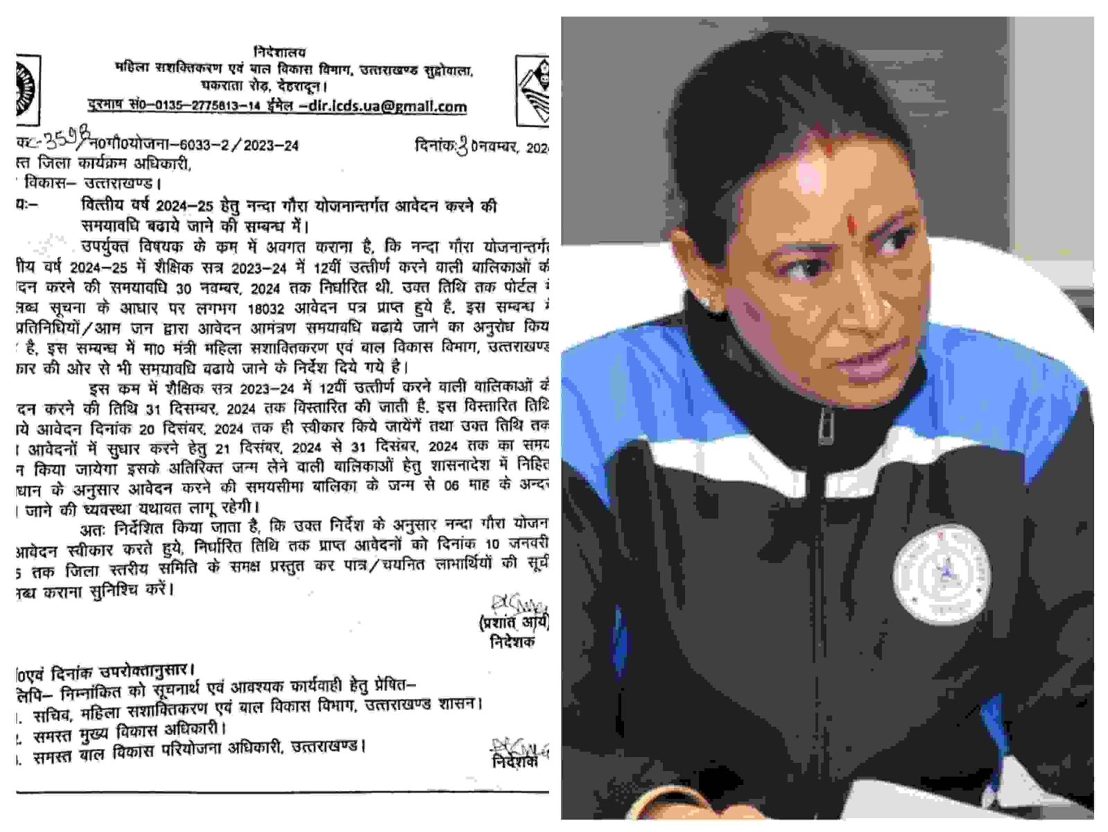 उत्तराखंड सरकार ने बेटियों को बड़ी राहत दी है। शासन ने नंदा गौरा योजना के तहत वित्तीय वर्ष 2024-25 के लिए आवेदन करने की तिथि को 30 नवंबर 2024 से बढ़ा कर 31 दिसंबर 2024 तक कर दी है। जिससे पात्र लाभार्थी अब नंदा गौरा योजना का लाभ लेने के लिए 31 दिसंबर तक आवेदन कर सकते है। जिसके आदेश जारी कर दिए गए है।