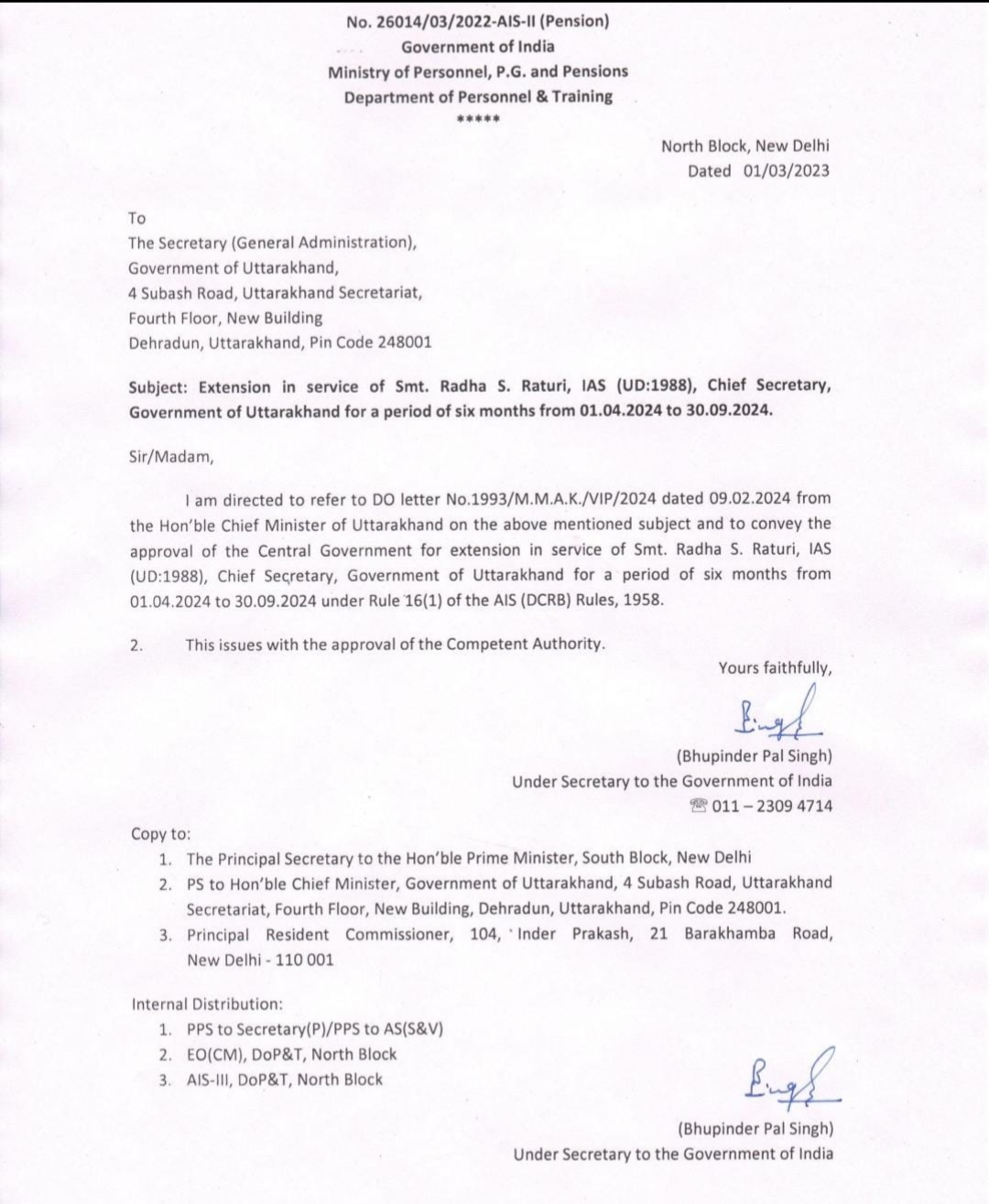 उत्तराखंड सरकार में मुख्य सचिव राधा रतूड़ी को 6 महीने का एक्सटेंशन दिया गया है