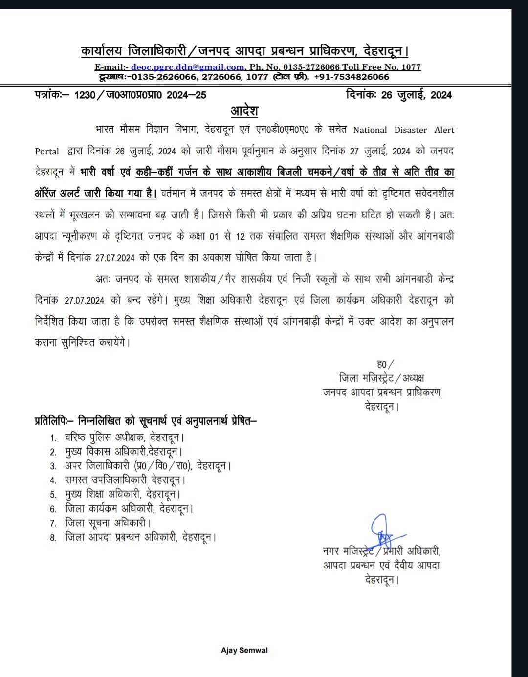 देहरादून जनपद और नगर क्षेत्र में 27 जुलाई को बंद रहेंगे स्कूल और शिक्षण संस्थान