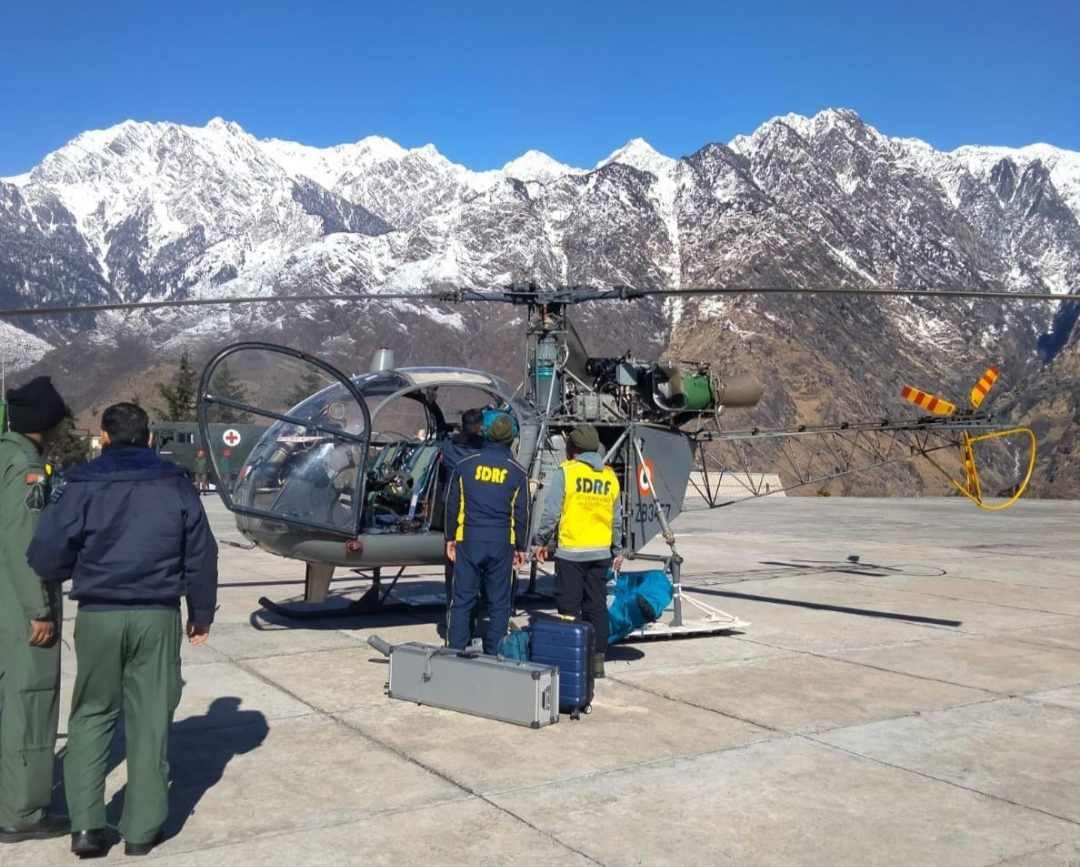 पुलिस महानिरीक्षक, SDRF रिधिम अग्रवाल के निर्देशानुसार माणा में एवलांच के दौरान लापता मजदूरों की खोज के लिए SDRF की एक विशेषज्ञ टीम को विक्टिम लोकेटिंग कैमरा (V.L.C) एवं थर्मल इमेज कैमरा के साथ सहस्त्रधारा से हेलीकॉप्टर के माध्यम से घटनास्थल हेतु रवाना कर दिया गया है। इन उपकरणों (विक्टिम लोकेटिंग कैमरा (V.L.C) एवं थर्मल इमेज कैमरा) की सहायता से सर्चिंग का कार्य किया जाएगा।
