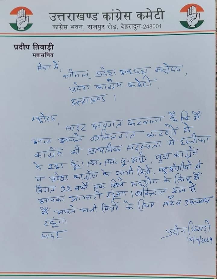उत्तराखंड कांग्रेस कमेटी के प्रदेश महासचिव प्रदीप तिवाड़ी ने कांग्रेस की प्राथमिक सदस्यता से त्यागपत्र दिया।
