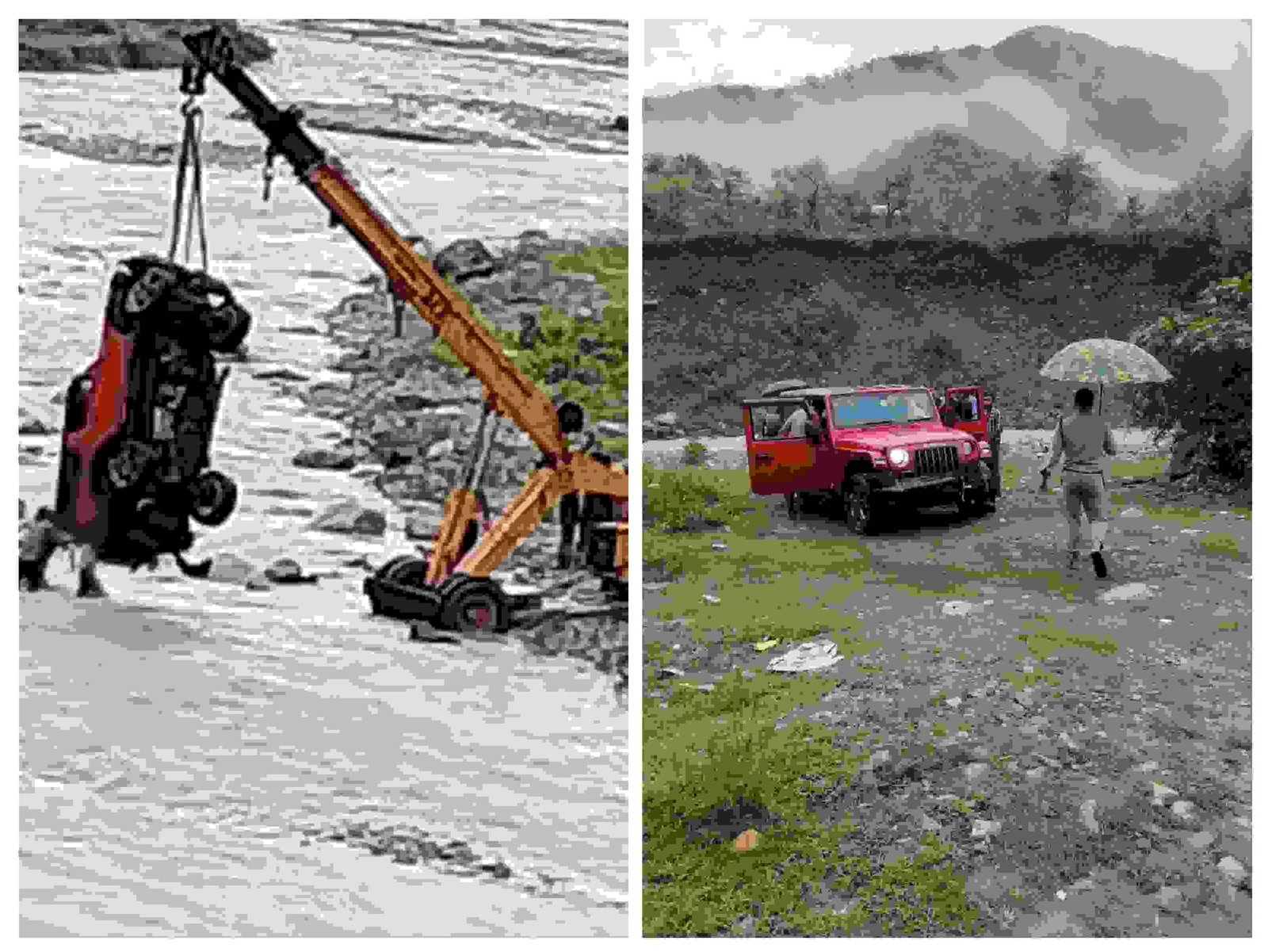 नदी के तेज बहाव के बीच फंसी थार कार को पुलिस ने JCB व क्रेन की सहायता से बाहर निकाल कर किया उसके मालिक के सुपुर्द