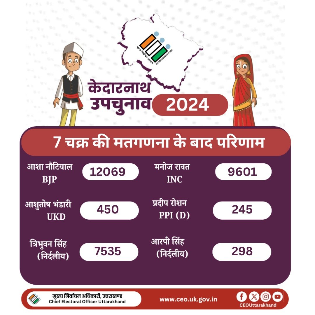 केदारनाथ विधानसभा उपचुनाव 2024 पहले 7 राउंड में किस प्रत्याशी ने ली बढ़त